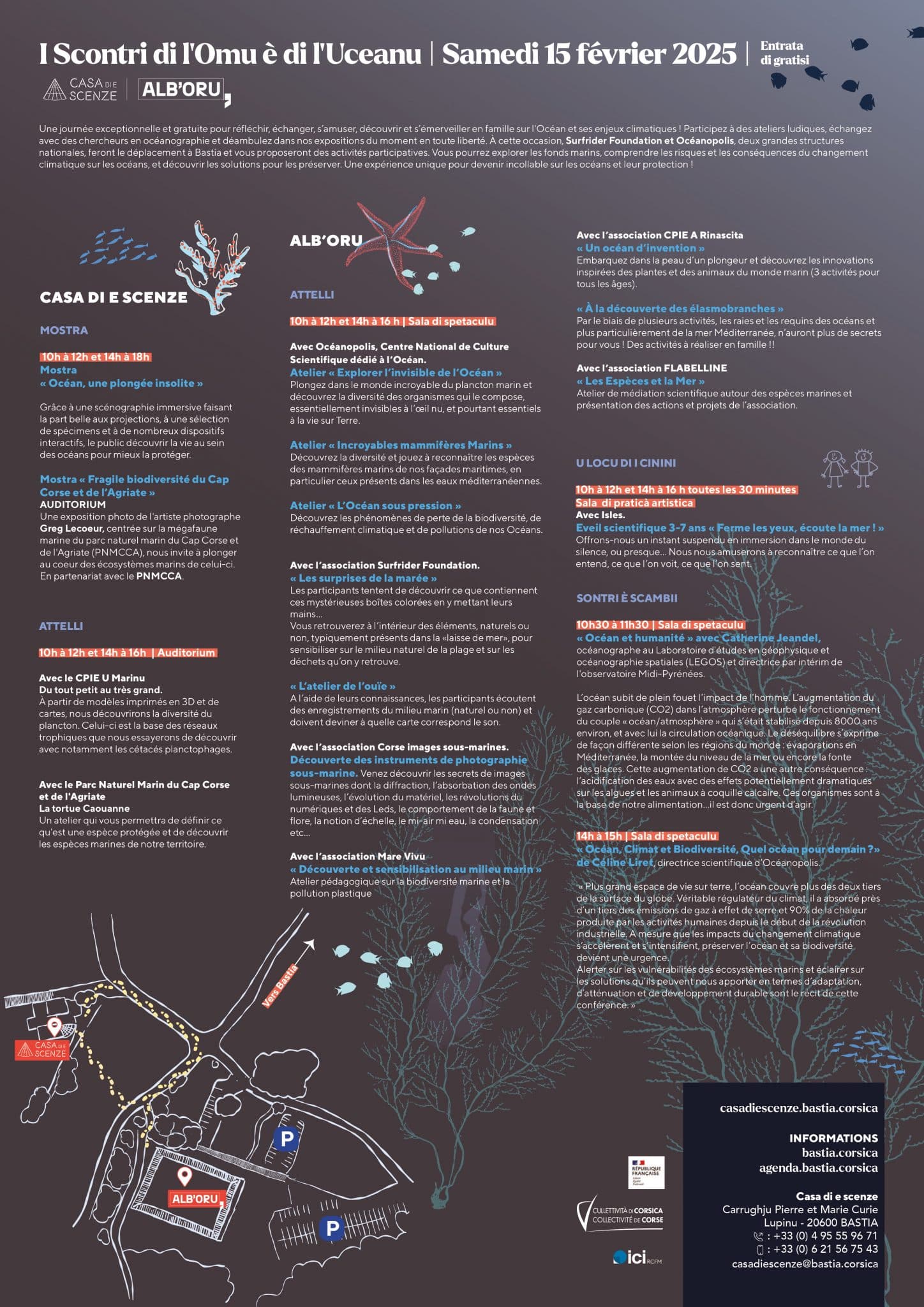 À cette occasion, Surfrider Foundation et Océanopolis, deux grandes structures nationales, feront le déplacement à Bastia et vous proposeront des activités participatives. Vous pourrez explorer les fonds marins, comprendre les risques et les conséquences du changement climatique sur les océans, et découvrir les solutions pour les préserver.